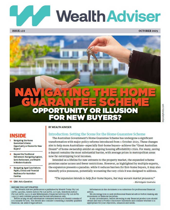 In this edition: Navigating the Home Guarantee Scheme: Opportunity or Illusion for New Buyers? Beyond the Traditional Retirement: Navigating Ageism, Semi-Retirement, and Wealth in Modern Australia. Navigating Aged Care Reform: Rights, Choice and Financial Resilience for Australian Families. Q&A: Ask a Question.