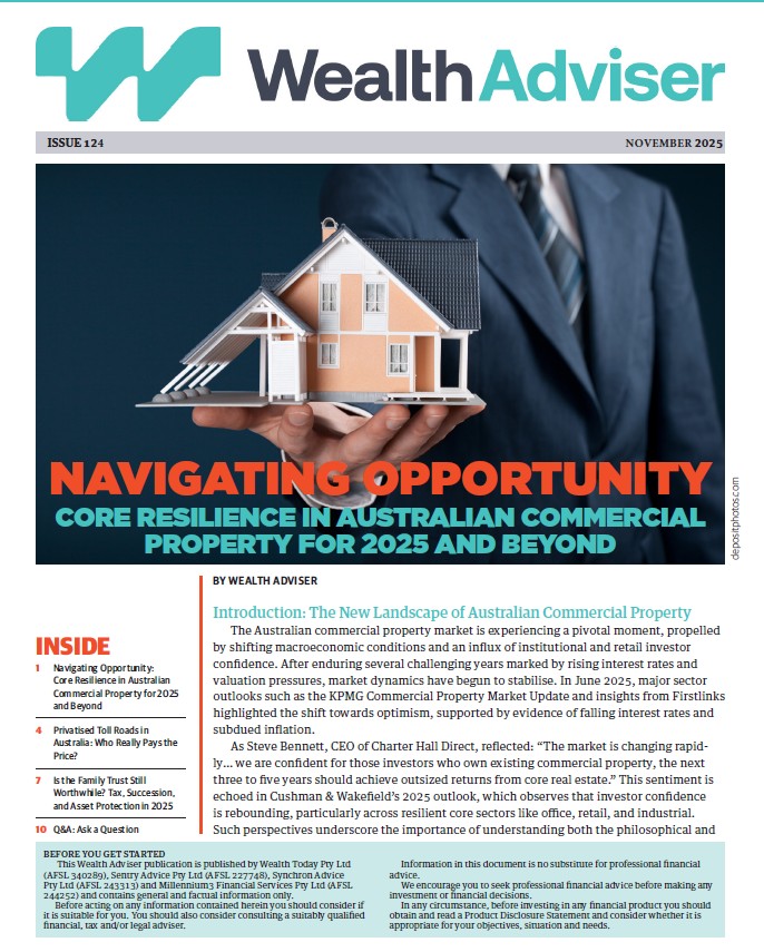 In this edition: Navigating Opportunity: Core Resilience in Australian Commercial Property for 2025 and Beyond. Privatised Toll Roads in Australia: Who Really Pays the Price? Is the Family Trust Still Worthwhile? Tax, Succession, and Asset Protection in 2025. Q&A: Ask a Question.