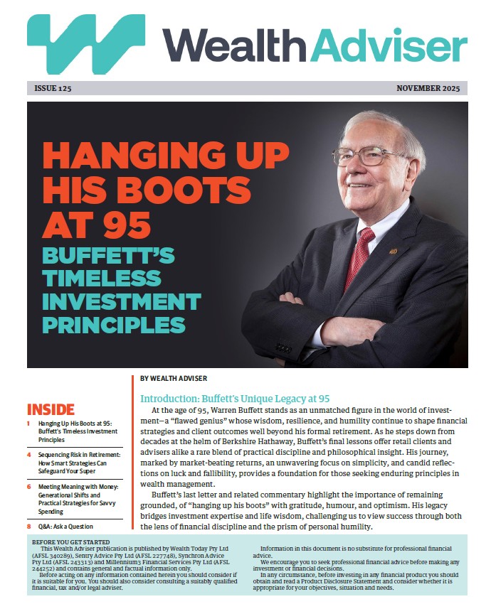 In this edition: Hanging Up His Boots at 95: Buffett’s Timeless Investment Principles. Sequencing Risk in Retirement: How Smart Strategies Can Safeguard Your Super. Meeting Meaning with Money: Generational Shifts and Practical Strategies for Savvy Spending. Q&A: Ask a Question.